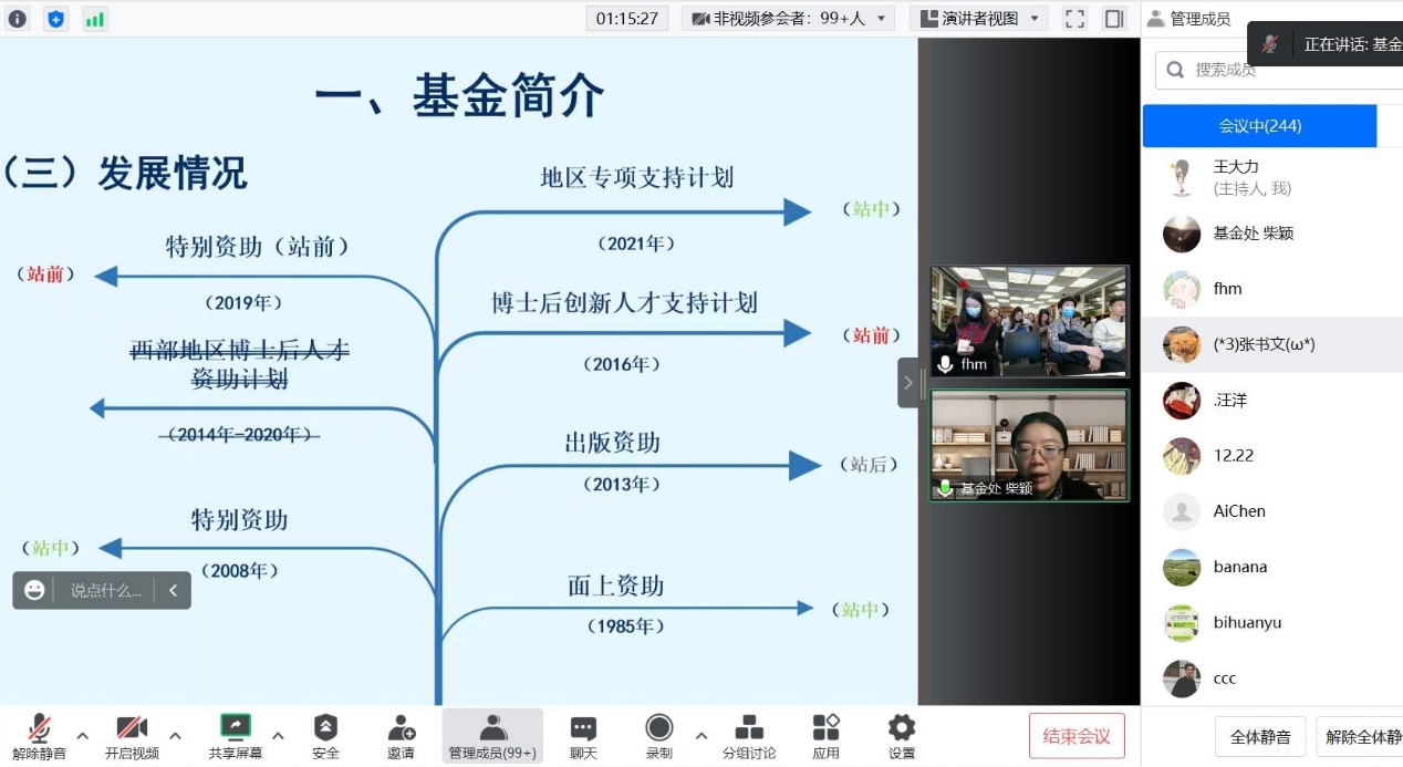 随后,柴颖副处长就中国博士后科学基金资助项目的设立背景、发展情况、资助类型与要求、申报政策新变化、专家评审、经费使用和管理、申请材料的撰写与注意事项、2023年资助工作时间安排等方面对《2023年中国博士后科学基金政策》进行了全面、透彻的解读。与会博士后就中国博士后科学基金申请书撰写原则和细节、基金申请时间节点与政策进行了提问,柴颖副处长逐一耐心解答。